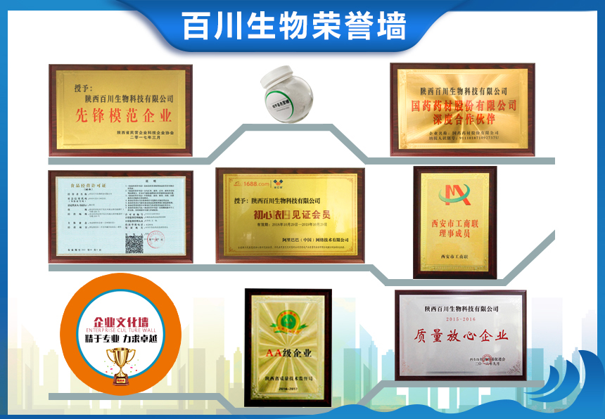 ??? 專利成果 創(chuàng)新是企業(yè)持續(xù)發(fā)展的動力保證。陜西百川生物通過原始創(chuàng)新、集成創(chuàng)新和引進消化吸收再創(chuàng)新,形成了微生物發(fā)酵、工藝開發(fā)、天然產(chǎn)物提取等多項核心技術(shù),實現(xiàn)了系列產(chǎn)品生產(chǎn)技術(shù)的全面提升?,F(xiàn)已申請和授權(quán)包括《魚皮膠原蛋白生物活性小肽及其制備方法》、《一種花生多肽及其制備方法》等在內(nèi)的近百項功能驗證專利。全面運用于產(chǎn)品生產(chǎn),贏得市場好評。